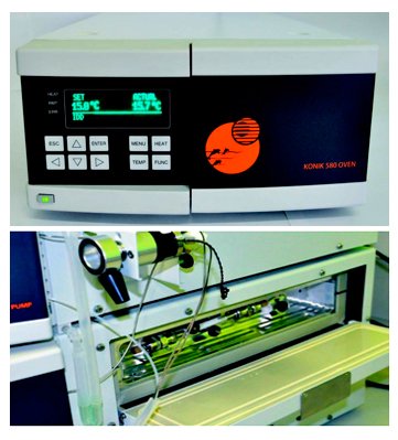 While HPLC model 600A is being redesigned to 600B Plus for optimal HPLC+GC-MS, the KONIK HPLC 580 has been purposely updated for fast/high pressure HPLC , in both low pressure 4 solvents gradient formation, or high pressure binary gradients. An upper pressure limit of 60 MPa (600 barr or 8.700 psi), and flow range from 0,01 to 10 ml makes the 580 HPLC suitable for micro and conventional HPLC and a wide range of columns particle sizes (1,5, 3, 5 and 10 microns) including new low backpressure hollow packing. Isocratic, and preparative versions (40 Mpa and 0,1 to 50 ml/min) of the 580 pump are also available by easy exchange of the pump head. The 580 design has facilitated improvements on the pump flow control with even lower pulsation than previous models, better accuracy and reproducibility of gradient formation, and a more compact oven for better column temperature control. The 580 oven is now housed in the same modular chassis of the 580 series.
