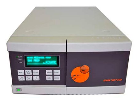 While HPLC model 600A is being redesigned to 600B Plus for optimal HPLC+GC-MS, the KONIK HPLC 580 has been purposely updated for fast/high pressure HPLC , in both low pressure 4 solvents gradient formation, or high pressure binary gradients. An upper pressure limit of 60 MPa (600 barr or 8.700 psi), and flow range from 0,01 to 10 ml makes the 580 HPLC suitable for micro and conventional HPLC and a wide range of columns particle sizes (1,5, 3, 5 and 10 microns) including new low backpressure hollow packing. Isocratic, and preparative versions (40 Mpa and 0,1 to 50 ml/min) of the 580 pump are also available by easy exchange of the pump head. The 580 design has facilitated improvements on the pump flow control with even lower pulsation than previous models, better accuracy and reproducibility of gradient formation, and a more compact oven for better column temperature control. The 580 oven is now housed in the same modular chassis of the 580 series.